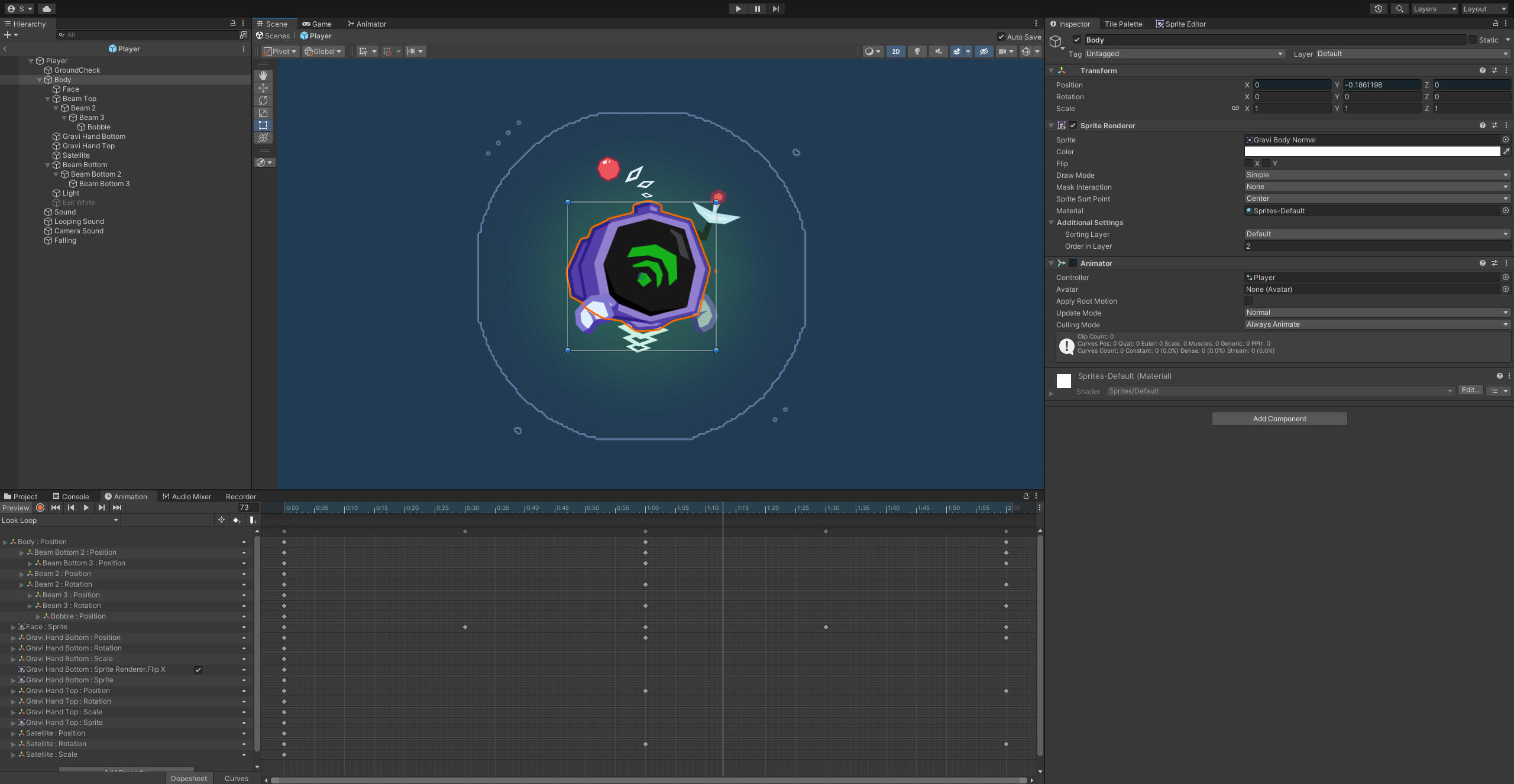 On the art side, I made use of parallax backgrounds and a 2D rig on Gravi, the main character, as I wanted to create animations quickly without having to make new frames on a sprite sheet. I really like the look!